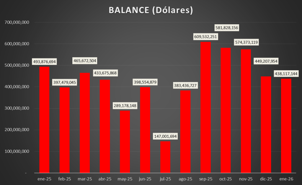 Las importaciones totales en enero de 2026 fueron de 61,12 MMu$s y las exportaciones de 499,24 MMu$s, resultando un balance positivo de 438,12 MMu$s.