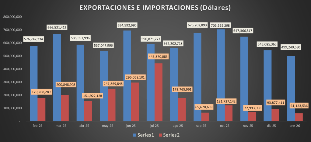 En enero de 2026 las importaciones bajaron, respecto de diciembre de 2025, un 34,89%, mientras que las exportaciones bajaron un 8,07%.