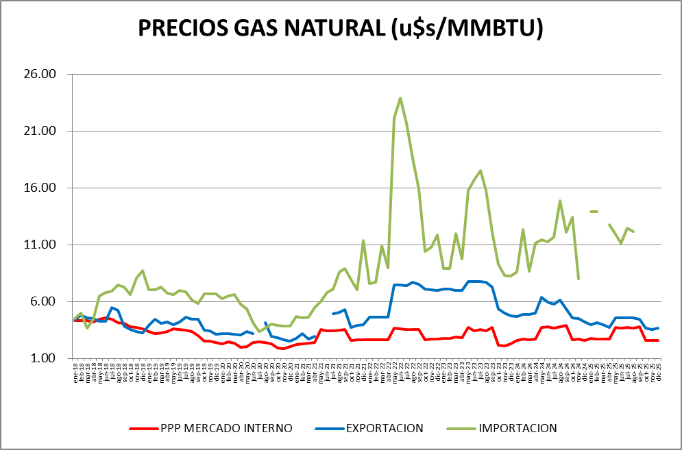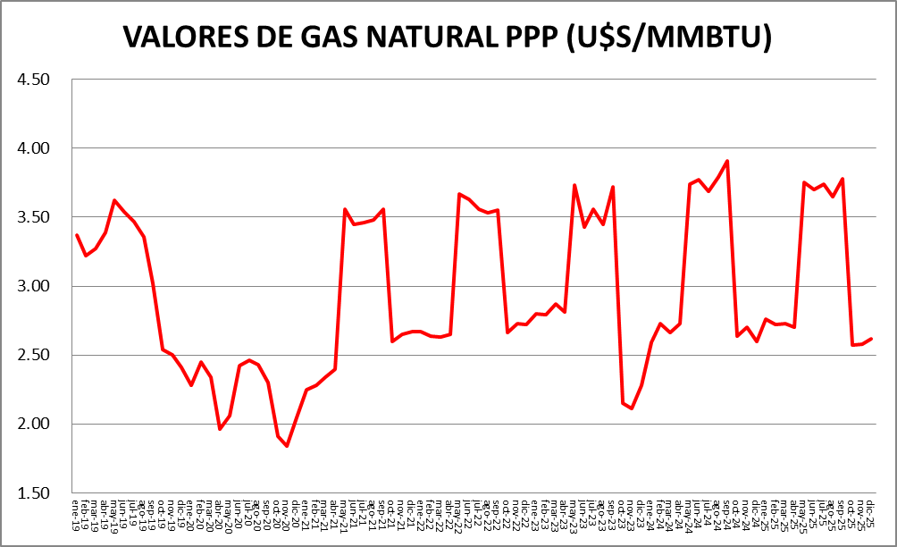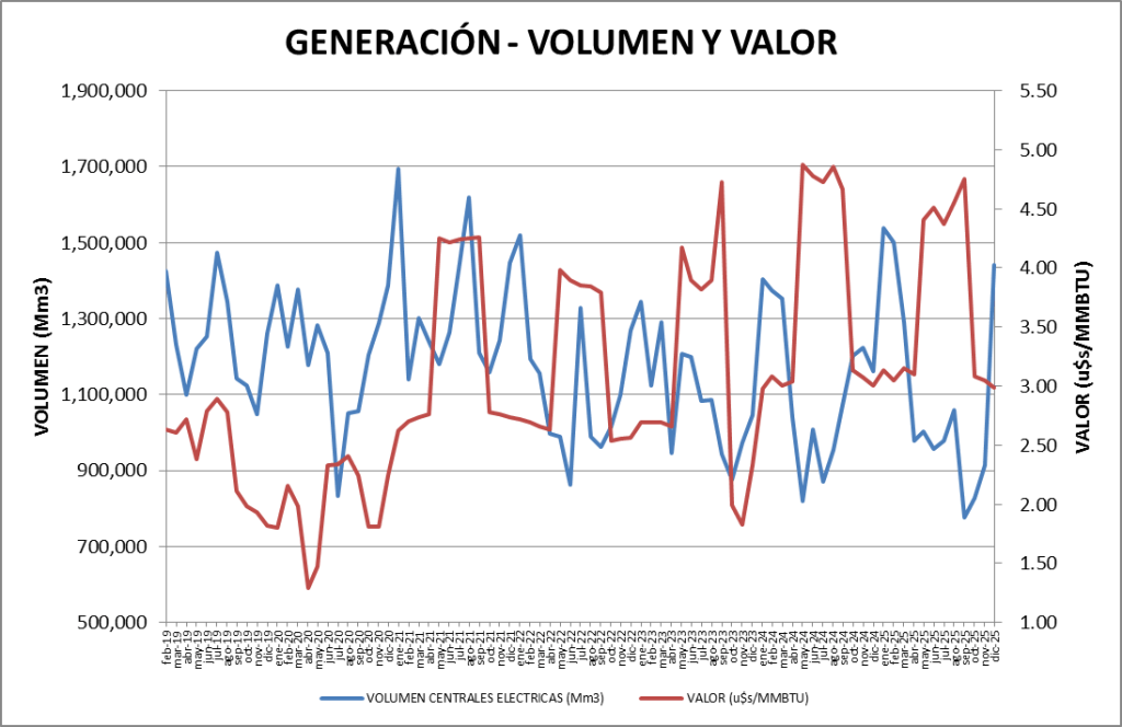 El precio del gas natural dirigido a la generación eléctrica, en diciembre de 2025, bajó un 2,0% respecto a noviembre y es un 0,3% menor al de diciembre de 2024.