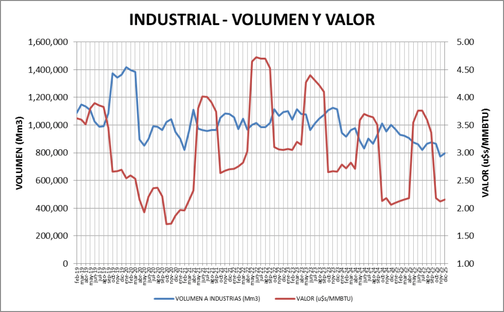 El valor del gas natural con dirección al sector industrial bajó un 1,9% en diciembre de 2025 respecto a noviembre de 2025.